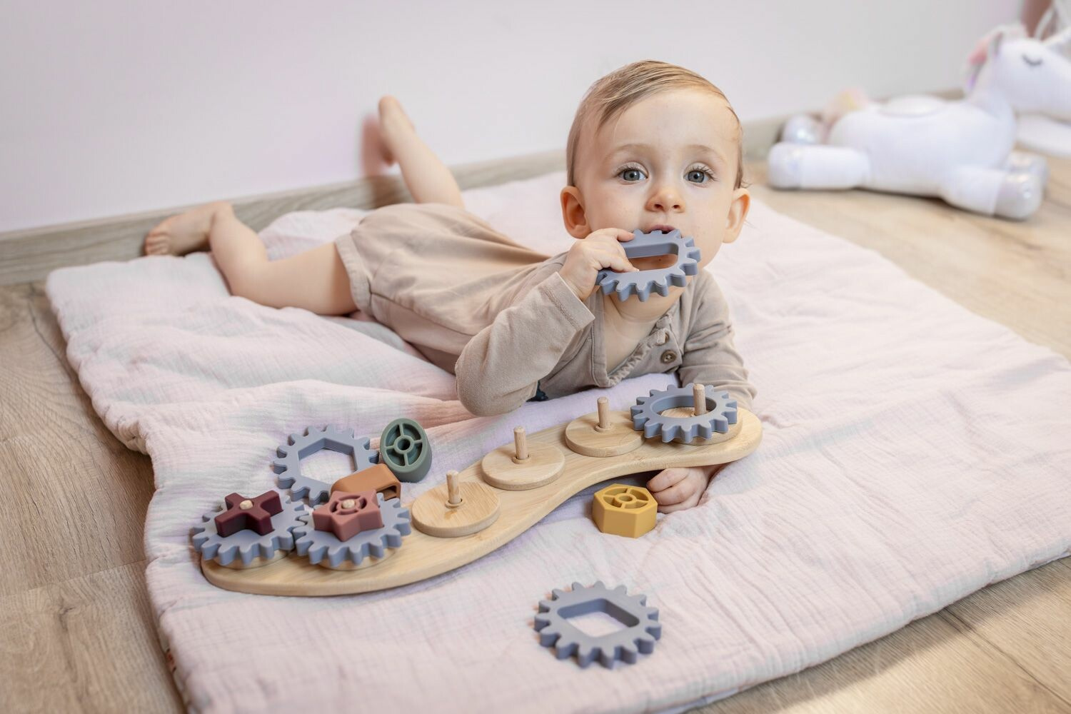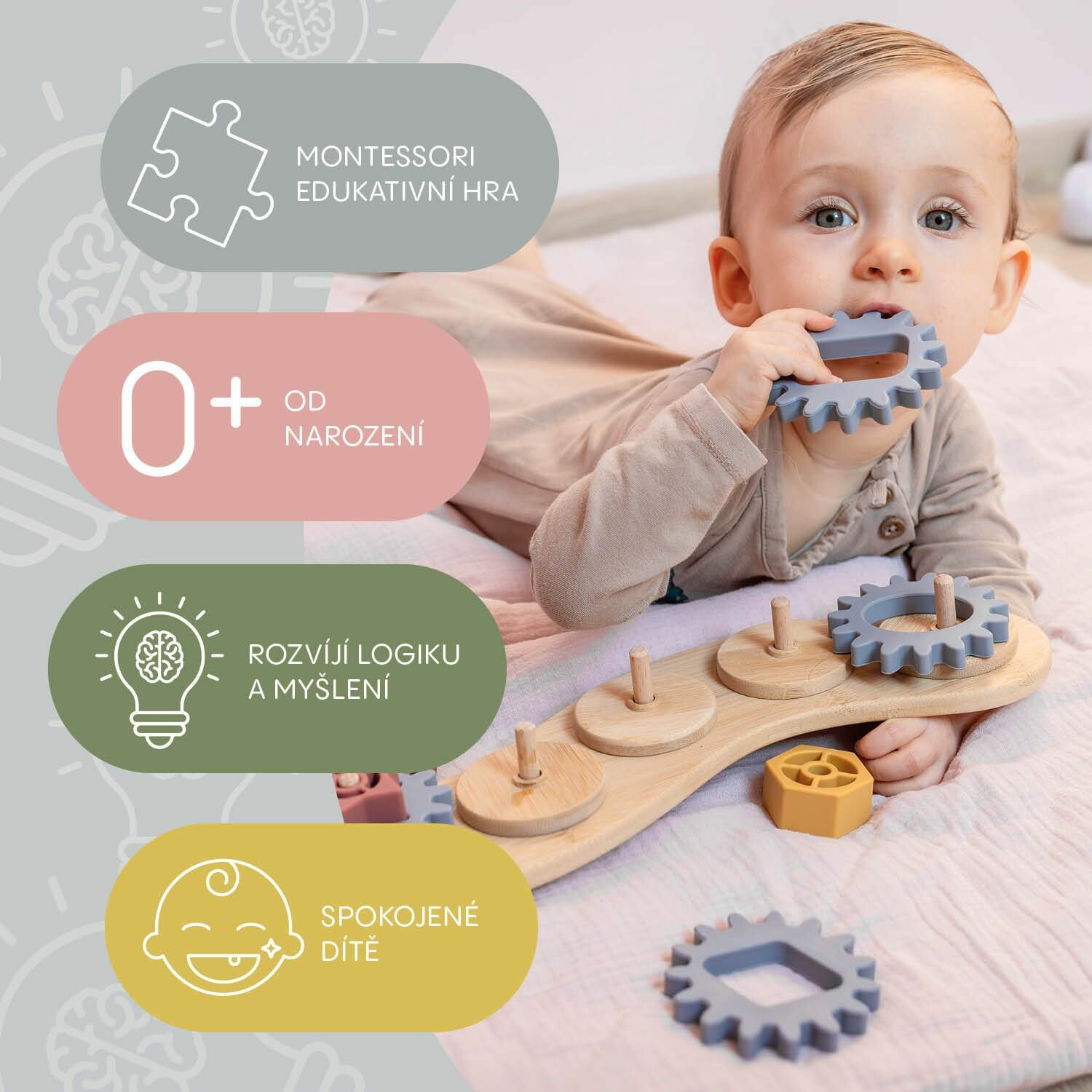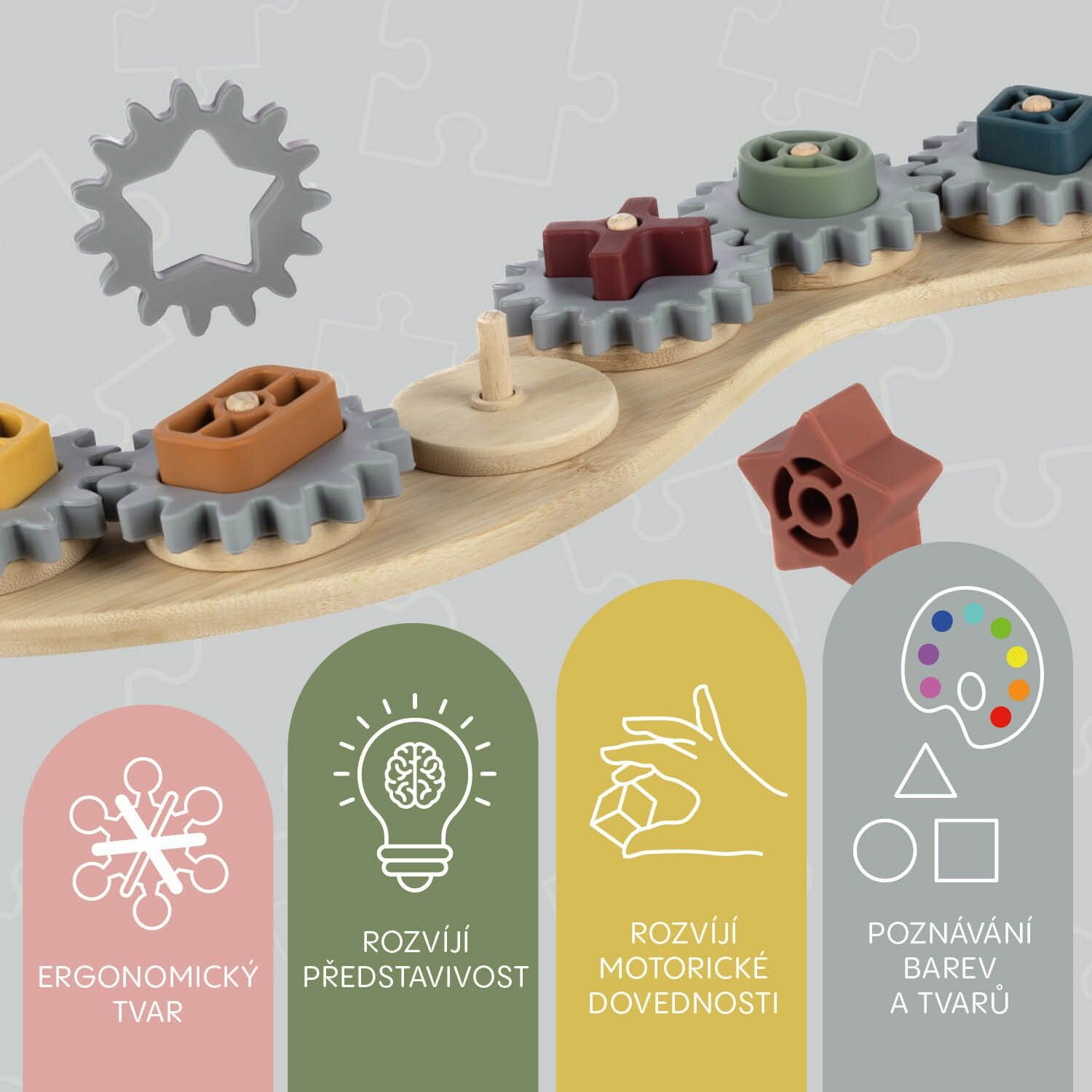Vzdělávací silikonová skládačka s ozubenými kolečky pro rozvoj motoriky a logického myšlení hravou formou.