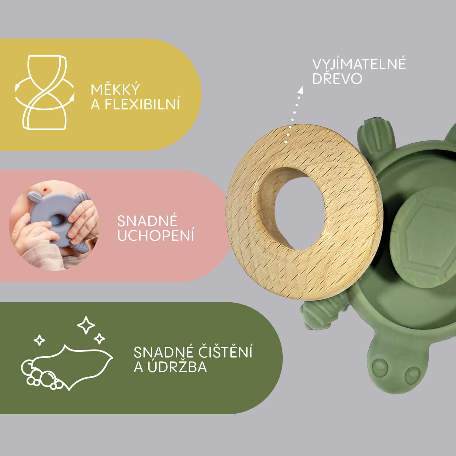 Vaše děťátko si okamžitě zamiluje naše roztomilé kousátko ve tvaru želvy, které spojuje přírodní dřevo s bezpečným silikonem. Ideální společník pro období prořezávání zoubků, který poskytuje úlevu od bolesti a současně rozvíjí smyslové vnímání vašeho miminka.