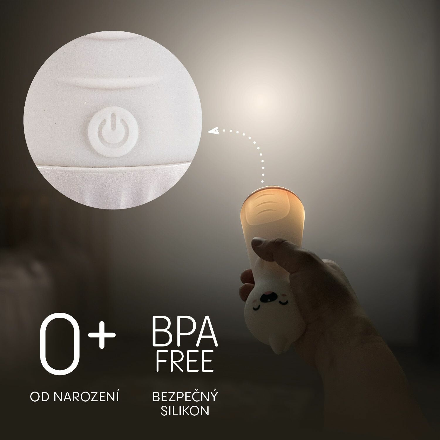 Světýlko je vybaveno stmívatelným bílým světlem, které snadno přizpůsobíte aktuálním potřebám. Pro vytvoření hravější atmosféry umožňuje plynulé přechody mezi barvami, které lze snadno měnit jemným poklepáním, případně zastavit na oblíbené barvě. Díky světýlku se bude váš malý dobrodruh cítit bezpečně a pomůže mu s usínáním.