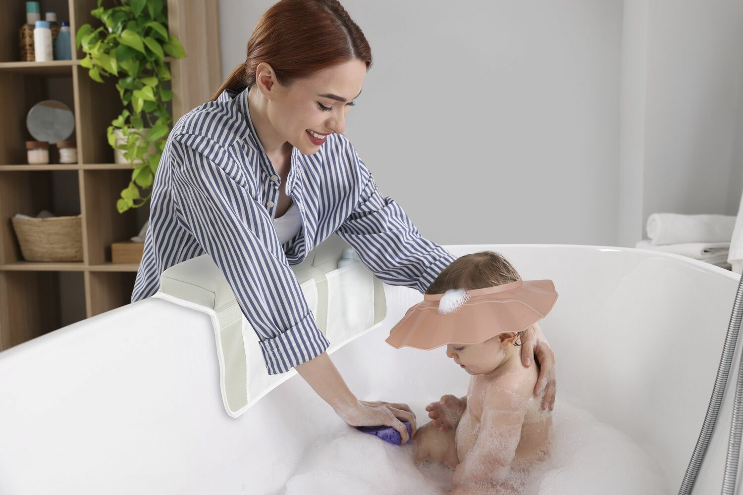 Proměňte každé mytí vlásků v pohodovou a příjemnou chvilku! Už žádná pěna v očích, která tak štípe – náš silikonový koupací kšilt chrání citlivé oči a uši vašeho dítěte před vodou a šamponem. Díky snadnému zapínání a jemnému materiálu kšilt perfektně přilne ke každé hlavičce, aniž by nepříjemně tlačil. Vhodný pro malé i větší děti.