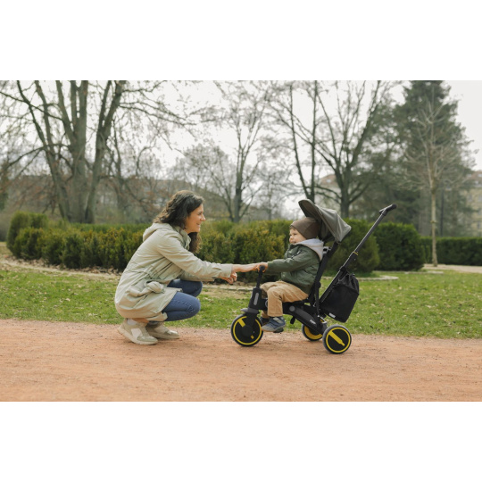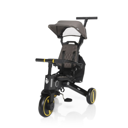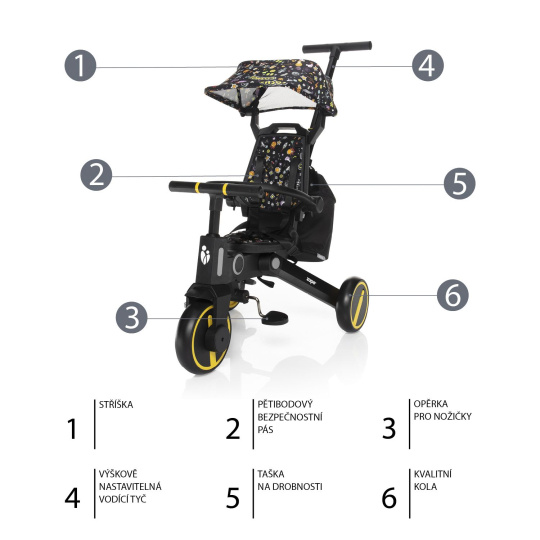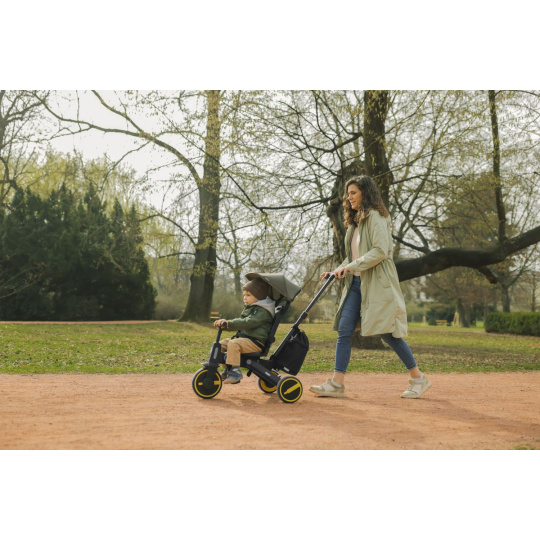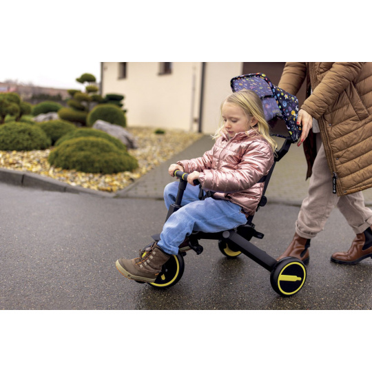 Tříkolka je pohodlnější alternativou ke kočárku a zároveň mezikrokem k odrážedlům a kolům. Díky výškově nastavitelné vodící tyči a funkci vypnutí řídítek plně nahradí kočárek a dítě si při jízdě užije více zábavy. Odnímatelná šlapátka se dají využít jako pedály, kdy dítě řídí tříkolku samo, nebo pro menší děti jako opěrka nohou. Komfortnější jízdu má na starost podsedák i opěrka zad, ty jsou opatřeny polstrováním, jenž je odnímatelné pro snadnější čistění.