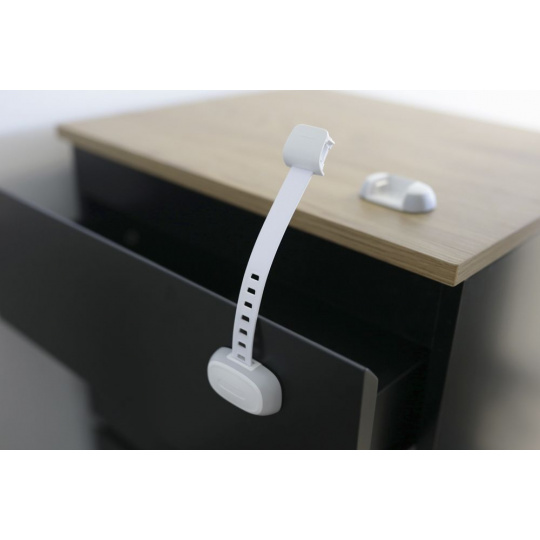 Univerzální zámek je možné instalovat na lednice, skříňky, toalety, zásuvky a libovolný nábytek. Zabraňuje otevření zásuvek i skříněk. Délku lze upravit podle potřeby. Pro otevření zámku slouží tlačítko, které děti nedokáží stisknout. Snadná instalace pomocí lepicí pásky a šroubováku.