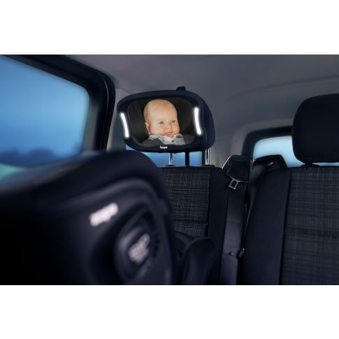 Mějte přehled o dítěti během jízdy i za tmy. Praktické zrcátko s LED osvětlením umožňuje na dítě vidět i za zhoršených světelných podmínek. Zrcátko je odolné proti rozbití a dá se snadno instalovat na opěrky hlavy sedadla. Má dlouhou výdrž baterií a dá se ovládat pomocí dálkového ovladače (zrcátko 3× AA, dálkové ovládání – 2× AAA. Baterie nejsou součástí balení.
